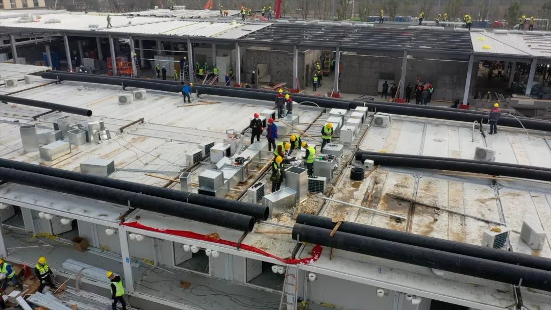 1月29日,醫(yī)護(hù)住宿區(qū)鋼結(jié)構(gòu)基本全部完工,并完成電力配套工程建設(shè),醫(yī)院全部通電。