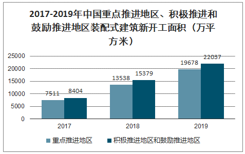 2017-2019年我國(guó)裝配式建筑重點(diǎn)推進(jìn)地區(qū)、積極推進(jìn)和鼓勵(lì)推進(jìn)地區(qū)的新開(kāi)工面積增長(zhǎng)顯著,其中重點(diǎn)推進(jìn)地區(qū)的新開(kāi)工面積從7511萬(wàn)平方米增長(zhǎng)至19678萬(wàn)平方米,年均復(fù)合增速61.86%;積極推進(jìn)和鼓勵(lì)推進(jìn)地區(qū)新開(kāi)工面積從8404萬(wàn)平方米增長(zhǎng)至22037萬(wàn)平方米,年均復(fù)合增速61.93%。