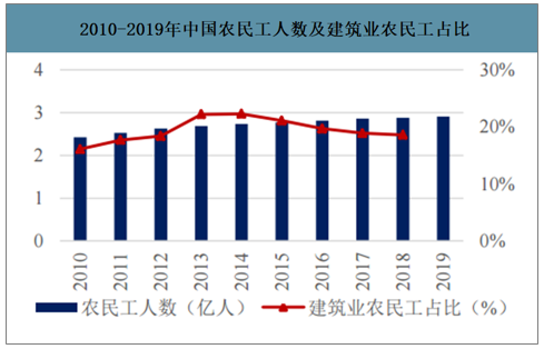 2010-2019年中國(guó)農(nóng)民工人數(shù)及建筑業(yè)農(nóng)民工占比