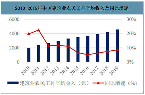 2010-2019年中國(guó)建筑業(yè)農(nóng)民工月平均收入及同比增速