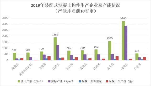 圖5 2019年裝配式混凝土構件生產企業及產能情況(產能排名前10省市)