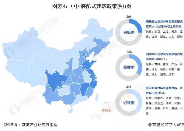 全國各省市響應(yīng)國家政策號召,陸續(xù)出臺政策規(guī)劃來促進(jìn)裝配式建筑行業(yè)的發(fā)展。根據(jù)“到2020年提出的裝配式建筑占比目標(biāo)”可將這些省市劃分為三類:積極型(明確提出到2020年實(shí)現(xiàn)裝配式建筑占比達(dá)到30%以上的目標(biāo))、穩(wěn)健型(到2020年實(shí)現(xiàn)裝配式建筑占比達(dá)到15-20%以上)、遲緩型(沒有明確目標(biāo)或詳細(xì)目標(biāo),或目標(biāo)不超過15%)。