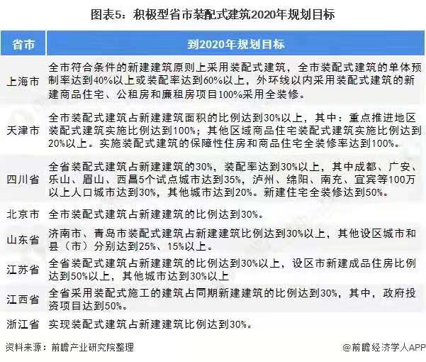 《“十三五”裝配式建筑行動方案》明確提出,到2020年全國裝配式建筑占新建建筑的比例達(dá)到15%以上,其中重點(diǎn)推進(jìn)地區(qū)達(dá)到20%以上,積極推進(jìn)地區(qū)達(dá)到15%以上,鼓勵推進(jìn)地區(qū)達(dá)到10%以上。