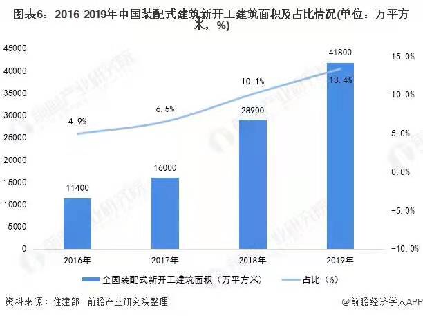 隨著各地積極推進(jìn)裝配式建筑項(xiàng)目落地,我國新建裝配式建筑規(guī)模不斷壯大。據(jù)住建部數(shù)據(jù)顯示,2016-2019年我國新建裝配式建筑面積逐年增長,2019年全國新開工裝配式建筑4.18億平方米,同比增長44.6%,近4年年均增長率為55%,占新建建筑面積13.4%。