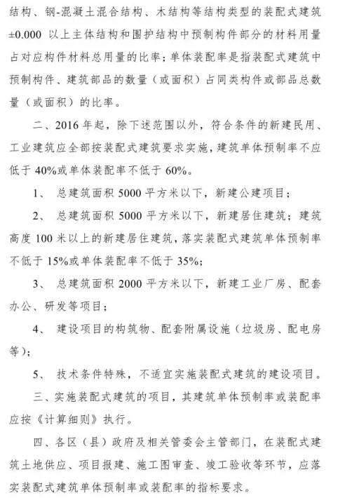二、2016年起,除下述范圍以外,符合條件的新建民用、工業建筑應全部按裝配式建筑要求實施,建筑單體預制率不應低于40%或單體裝配率不低于60%。