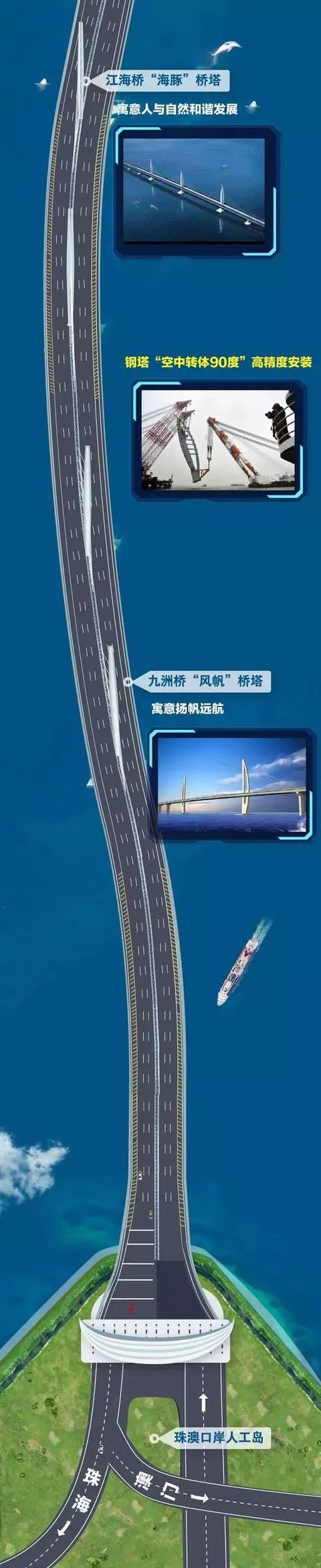 通車后,旅客從香港大嶼山口岸人工島出發,沿海岸一路前行12公里,就會抵達大橋東人工島,再穿越6.7公里海底隧道,即可上升到距離海面達50米、有著“中國結”美譽的青州橋上。之后,在海面上御風而行22公里,經過美麗的“海豚塔”江海橋和“風帆塔”九洲橋,抵達珠澳海濱。全橋跨海段總長42公里。