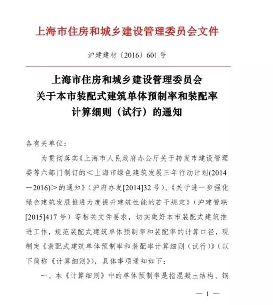 切實做好本市裝配式建筑推進工作,規范裝配式建筑單體預制率和裝配率的計算口徑,現制定《裝配式建筑單體預制率和裝配率計算細則(試行)》