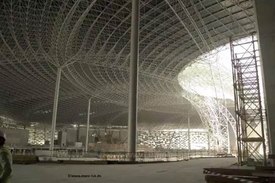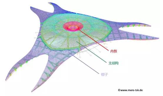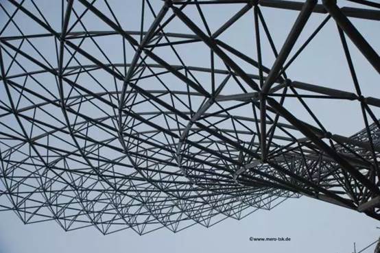 該主題公園被一個巨大的紅色屋頂覆蓋,整個鋼結構屋頂表面約 195,000 m²,采用美露空間框架結構,總計由 17 萬根桿件和約 42,200 個節點構成。整個結構被分成內核、主結構和鉗子三個子結構分別進行建模。該工程項目的設計計算采用了 RSTAB 和附加模塊 RS-COM。