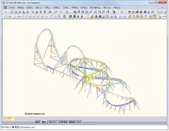 該建筑的長寬高分別約為 113 米、51 米和 30 米。整體結構共由 86 種不同截面的 6201 根鋼管組成。該工程項目的設計計算采用了 RSTAB 和附加模塊 RS-COM。對軌道結構分別按照中國和歐洲規范進行了承載能力極限狀態設計和疲勞設計,并在計算完成后生成了非常直觀的結果模型效果圖。