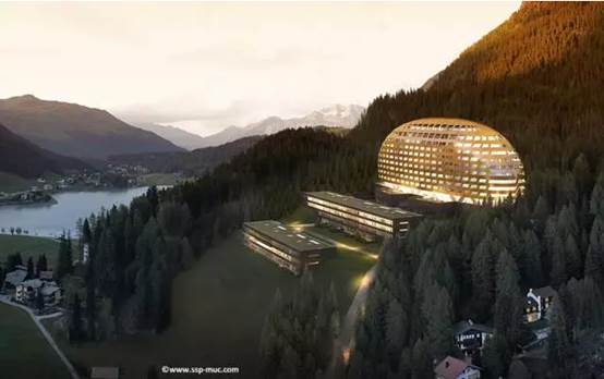 In December 2013, a hotel with extraordinary architecture was opened in Davos. The building has the shape of a "Golden Egg" and is situated on a mountainside. The hotel is elliptic in shape with all corners rounded out. It was constructed with reinforced concrete and its external dimensions are about 105 m x 40 m.