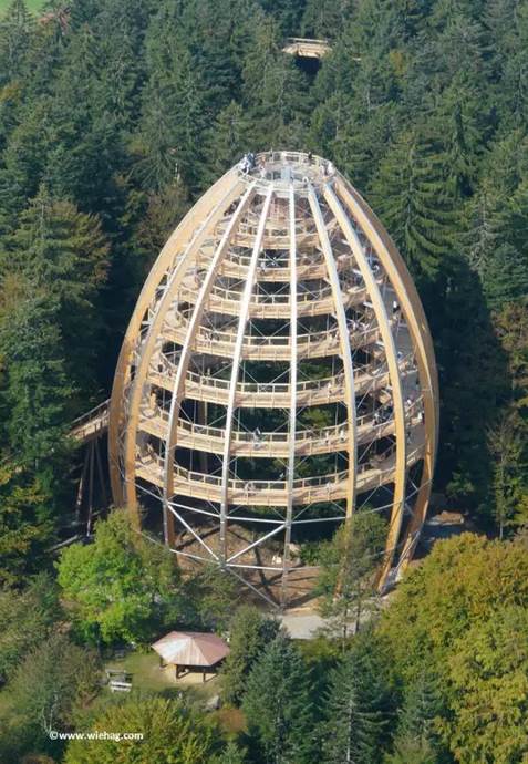 The egg-shaped tree tower was built around three trees with a height of up to 38 m, growing on a rock formation.The path leading through forest tree-tops has a total length of 1,300 m and is the longest tree-top walk worldwide. It was built in 2009 in the Bavarian Forest National Park in Germany. The walk's principal magnet of tourism is the walkable tree tower with a height of 44 m. It consists of a spiral structure with a length of 520 m, directly connected to the 780 m long tree-top walk.