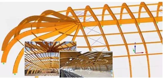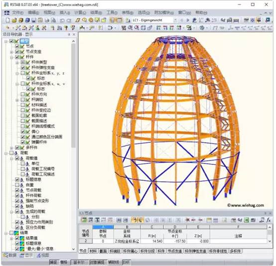 該蛋形木塔結構樹頂走道高 44 米,其螺旋形坡道長度為 520 米。該塔的主要支承結構由16 個旋轉對稱排列的弧形層板膠合木柱構成。上層柱間采用鋼支撐斜桿,底層柱間采用 4 個抗拉及抗壓的空心型鋼十字交叉支撐。木螺旋坡道通過鋼懸臂梁和拉桿固定在木柱上。該工程項目的設計計算采用了 RSTAB 以及相關附加模塊TIMBER、STEEL、RSBUCK、DYNAM。