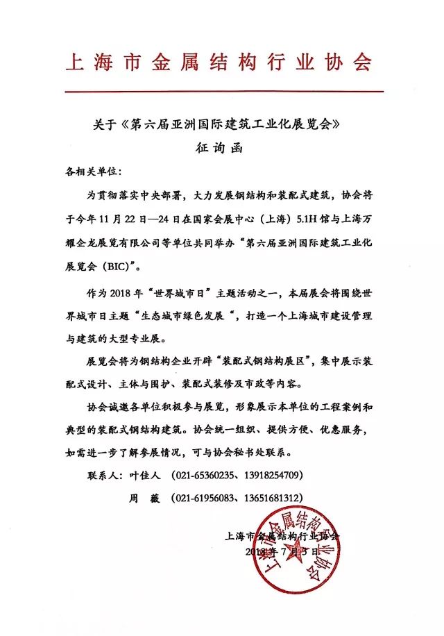 為貫徹落實中央部署,大力發(fā)展鋼結(jié)構(gòu)和裝配式建筑,協(xié)會將于今年11月22-24日在國家會展中心(上海)5.1H館與上海萬耀企龍展覽有限公司共同舉辦“BIC第六屆亞洲國際建筑工業(yè)化展覽會”。