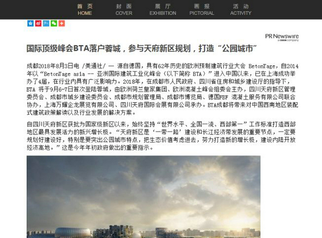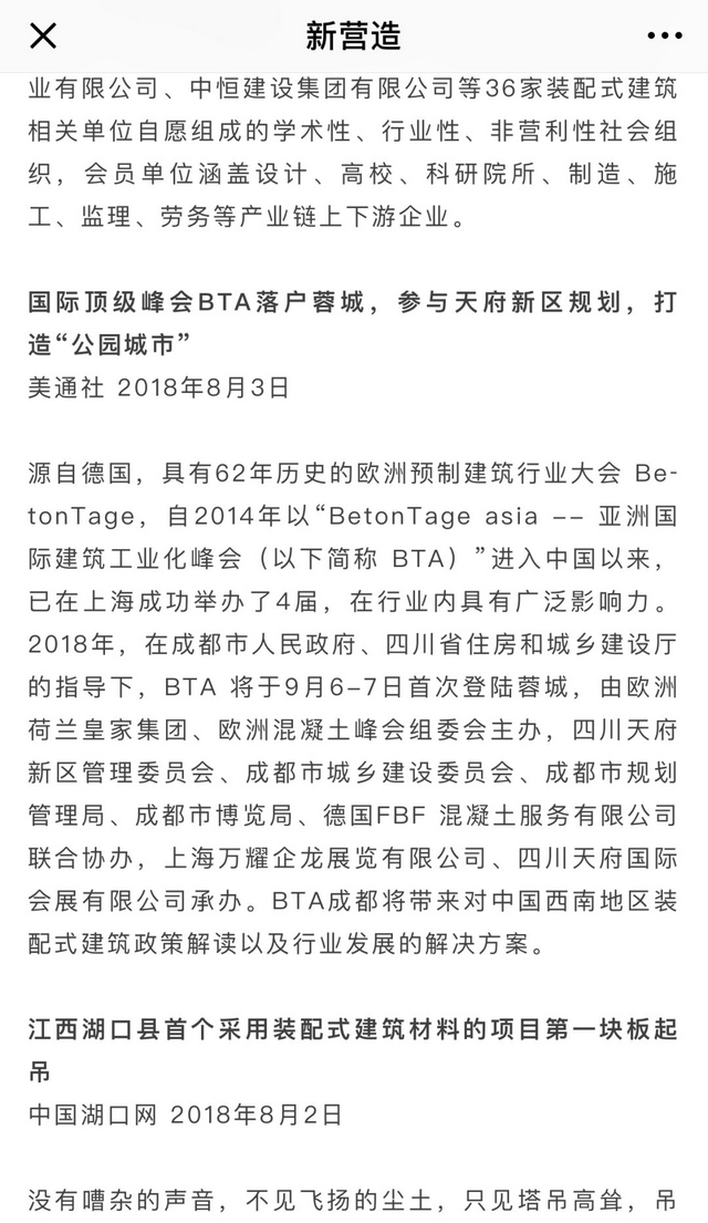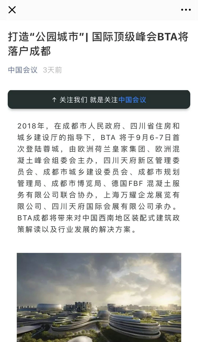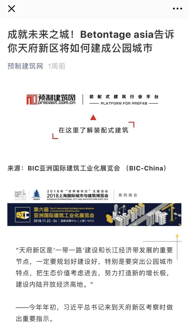 四川天府新城作為可持續發展的國際級新區,受到了全國各界的關注。近日,為規劃好新區,建設美麗宜居“公園城市”。四川天府新區管理委員會攜手亞洲國際建筑工業化展覽會(BIC),于2018年9月6-7日在四川在成都天府新區秦皇假日酒店隆重召開2018亞洲國際建筑工業化峰會(成都),簡稱“BTA成都”。