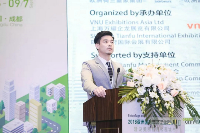為了此次論壇,專程從德國而來的歐洲混凝土峰會組委會大使Dominic Sturm發表致辭,首先很高興能與荷蘭皇家會展集團共同主辦此次論壇。作為BetonTage在德國的主辦方,我們很高興能與天府新區能有這次合作,共同為綠色城市建設努力。這是BTA在成都的第一次會議,特邀眾多國際專家分別從城市規劃、建筑設計、建筑工業化、智慧建筑及高效節能等角度為建設世界級綠色城市提供建議。另外,BTA已在上海成功舉辦了4屆,在行業內具有廣泛影響力。歡迎大家于2018年11月23-24日來上海參加第五屆上海國際建筑工業化峰會。最后,預祝此次會議取得圓滿成功。